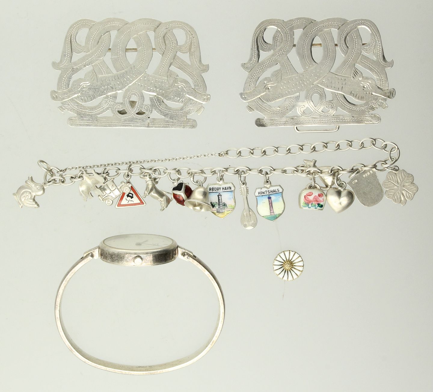Bæltespænde, armlænke med diverse charms af sølv, GJ marguerit defekt ørestik forgyldt sølv / hvid emalje samt Inex bøjle ur af sterling sølv.