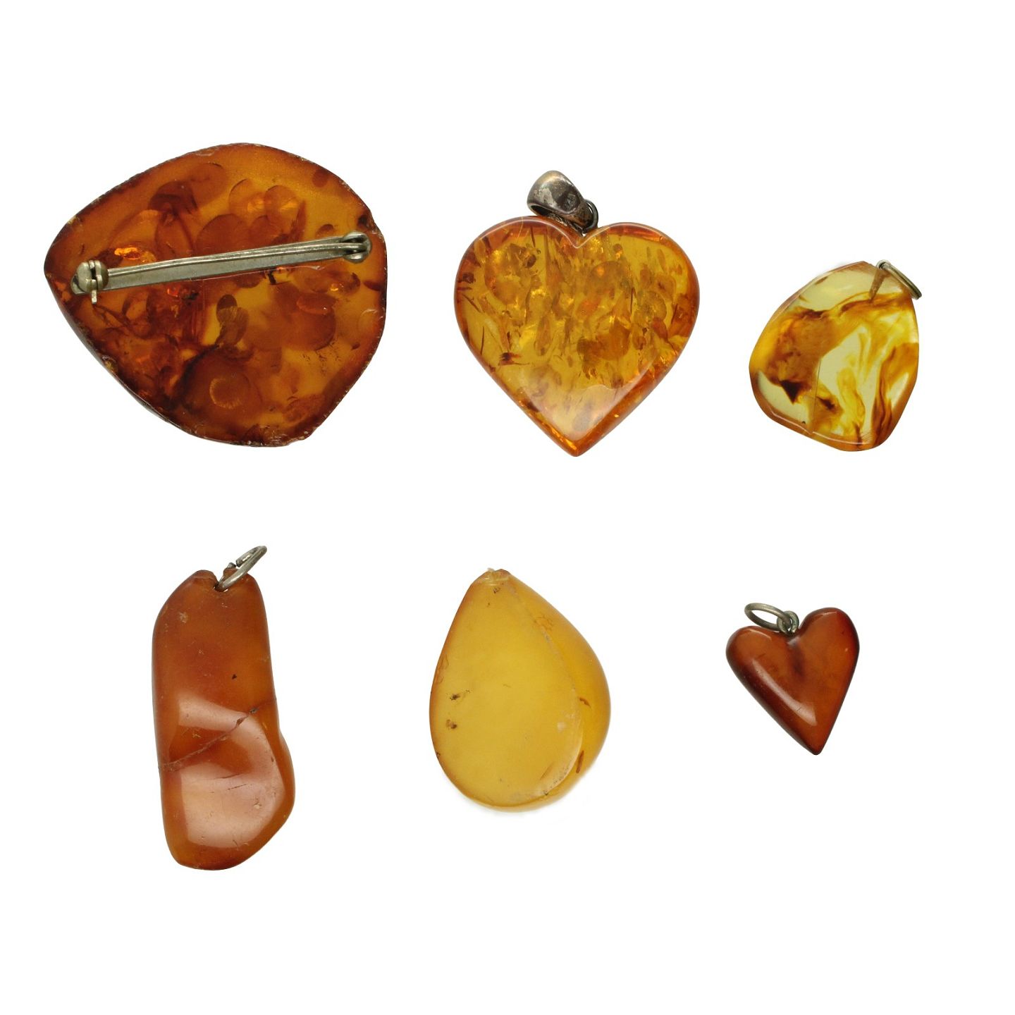 Samling poleret rav vedhæng samt broche (6)
