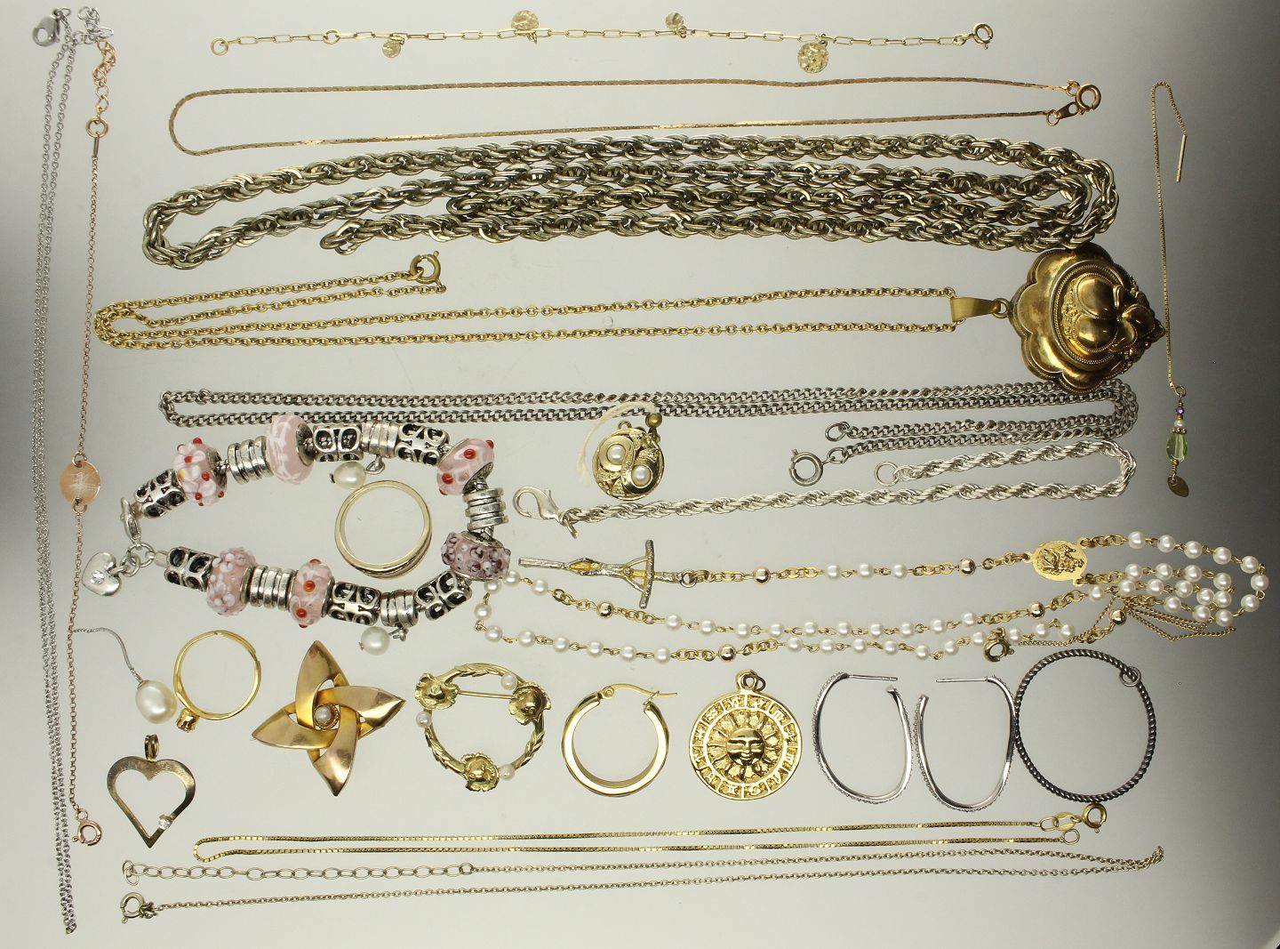 Otte halskæder, syv vedhæng, fire armlænker, par creoler, to enkelte øreringe, to brocher, to ringe samt to diverse dele.