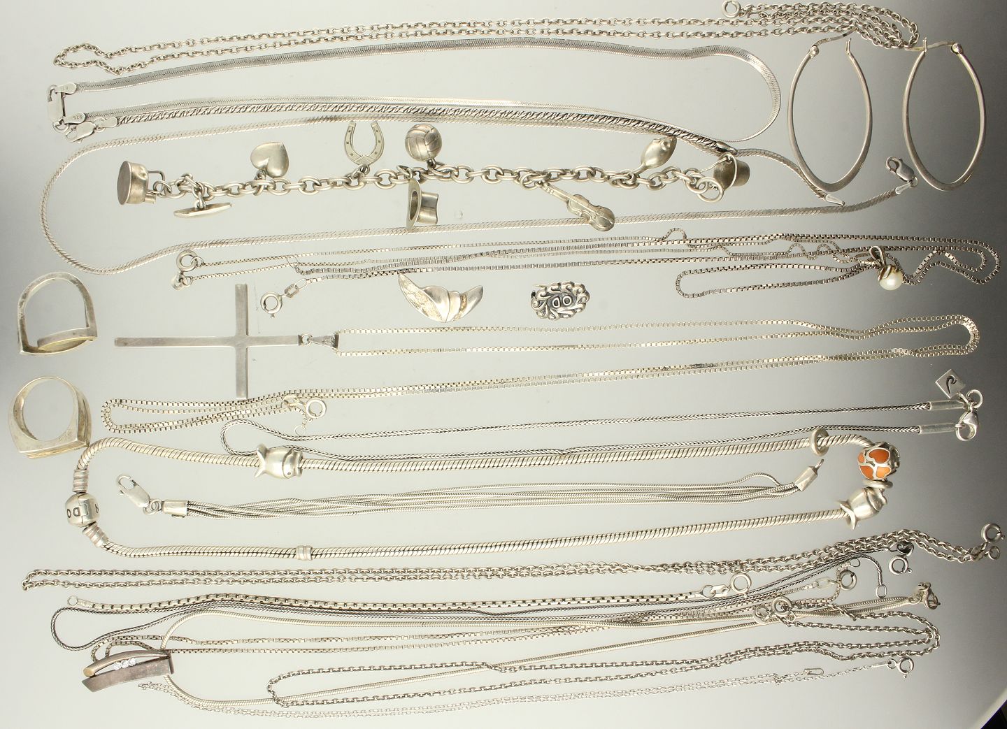 14 halskæder, syv vedhæng, fire armlænker, et par øreringe, en lille broche samt to ringe (en med belægning af guld).