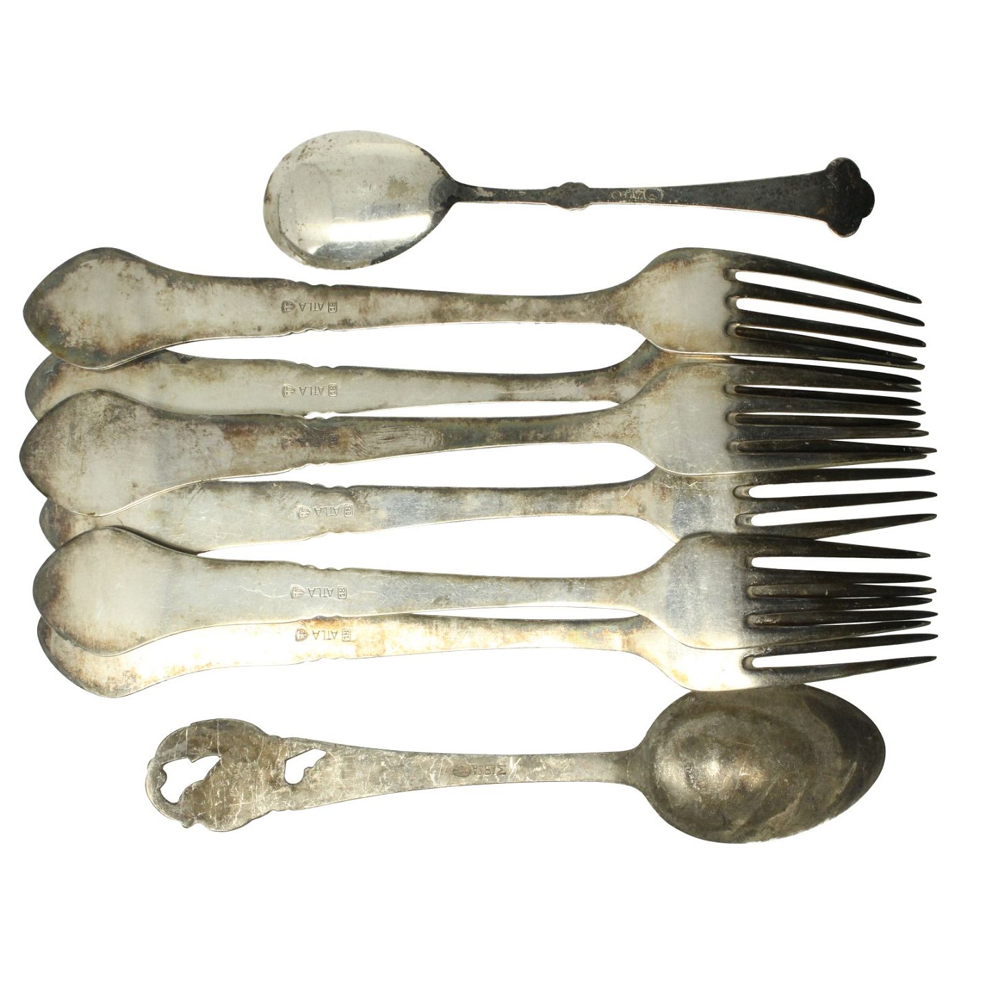 Samling diverse bestik af plet sølv (6)