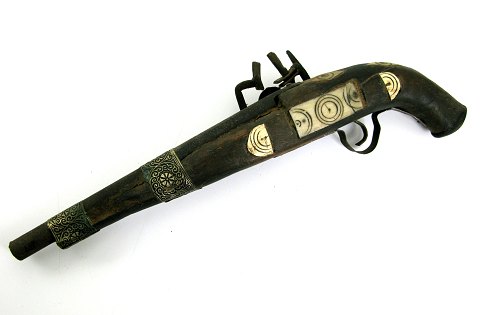 Modificeret flintelåspistol af arabisk oprindelse til dekorationsbrug. L. 43 cm. Oprindelig Arabien, tidl. 1800'tallet.