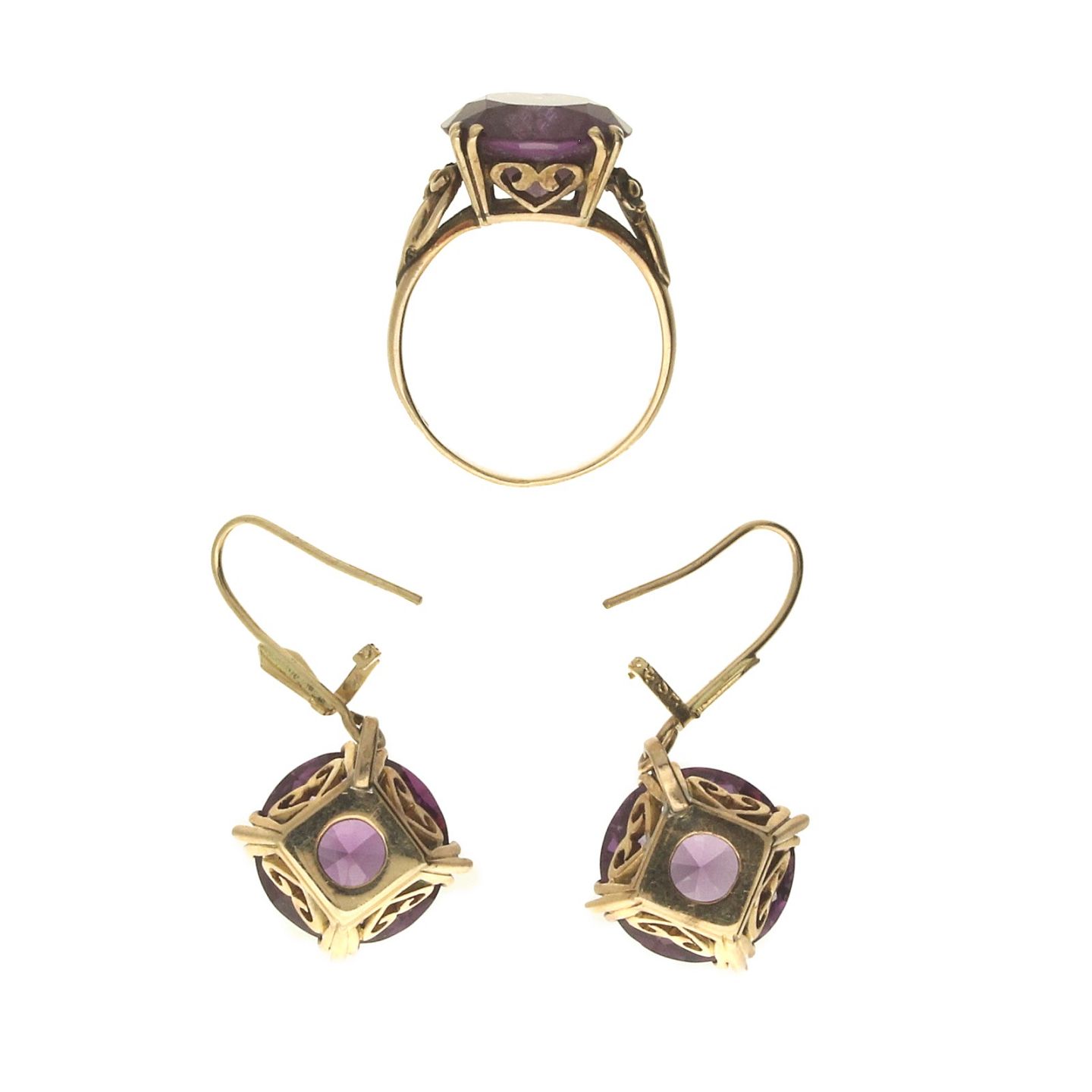 Par øreringe samt ring af 8 kt. guld fattet med ametyst