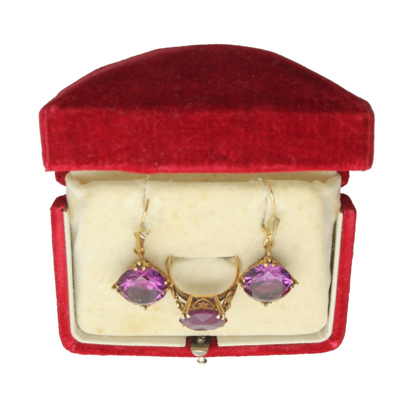 Par øreringe samt ring af 8 kt. guld fattet med ametyst