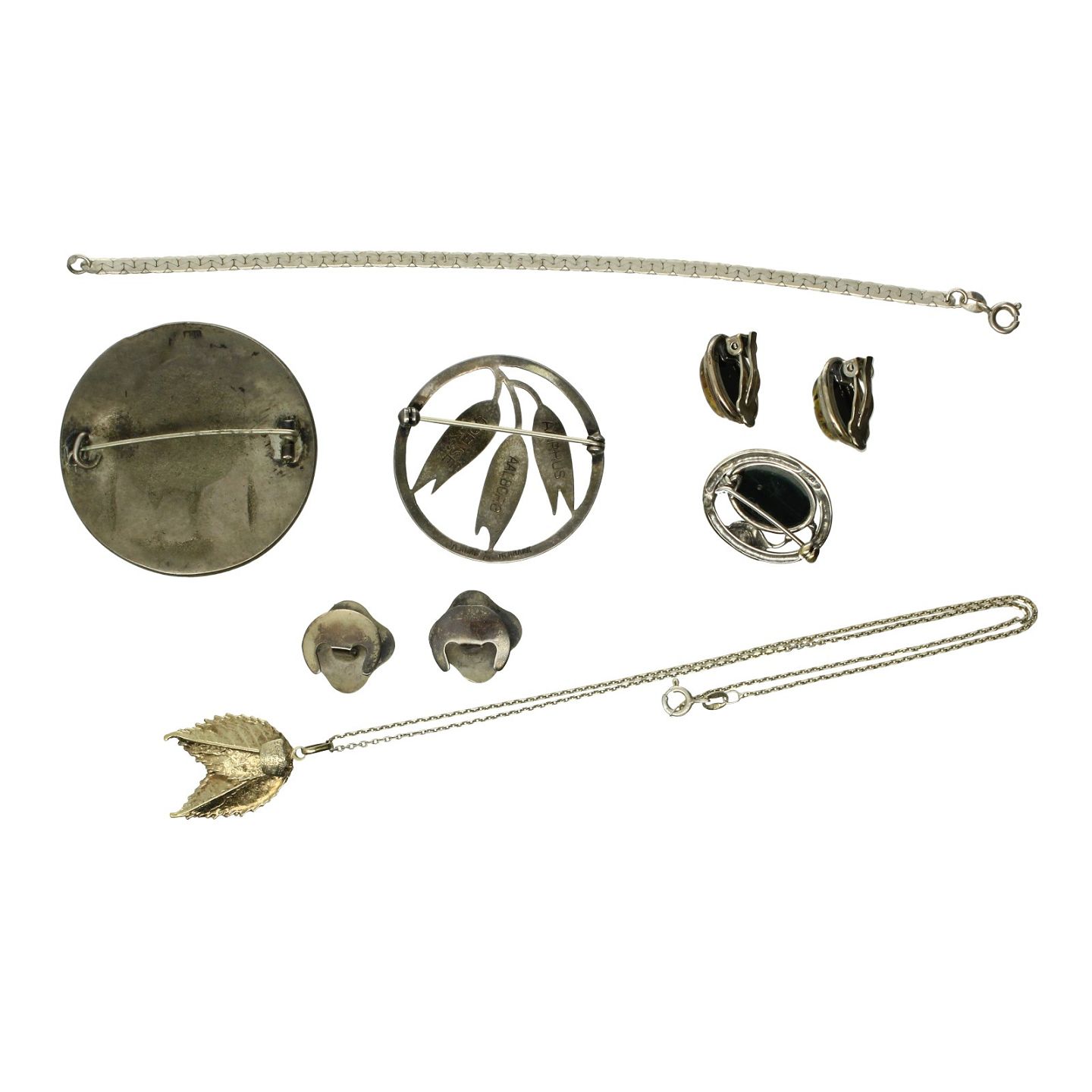 Tre brocher, en armlænke, en halskæde, et vedhæng, et par øreclips samt et par knaphuls mærker.