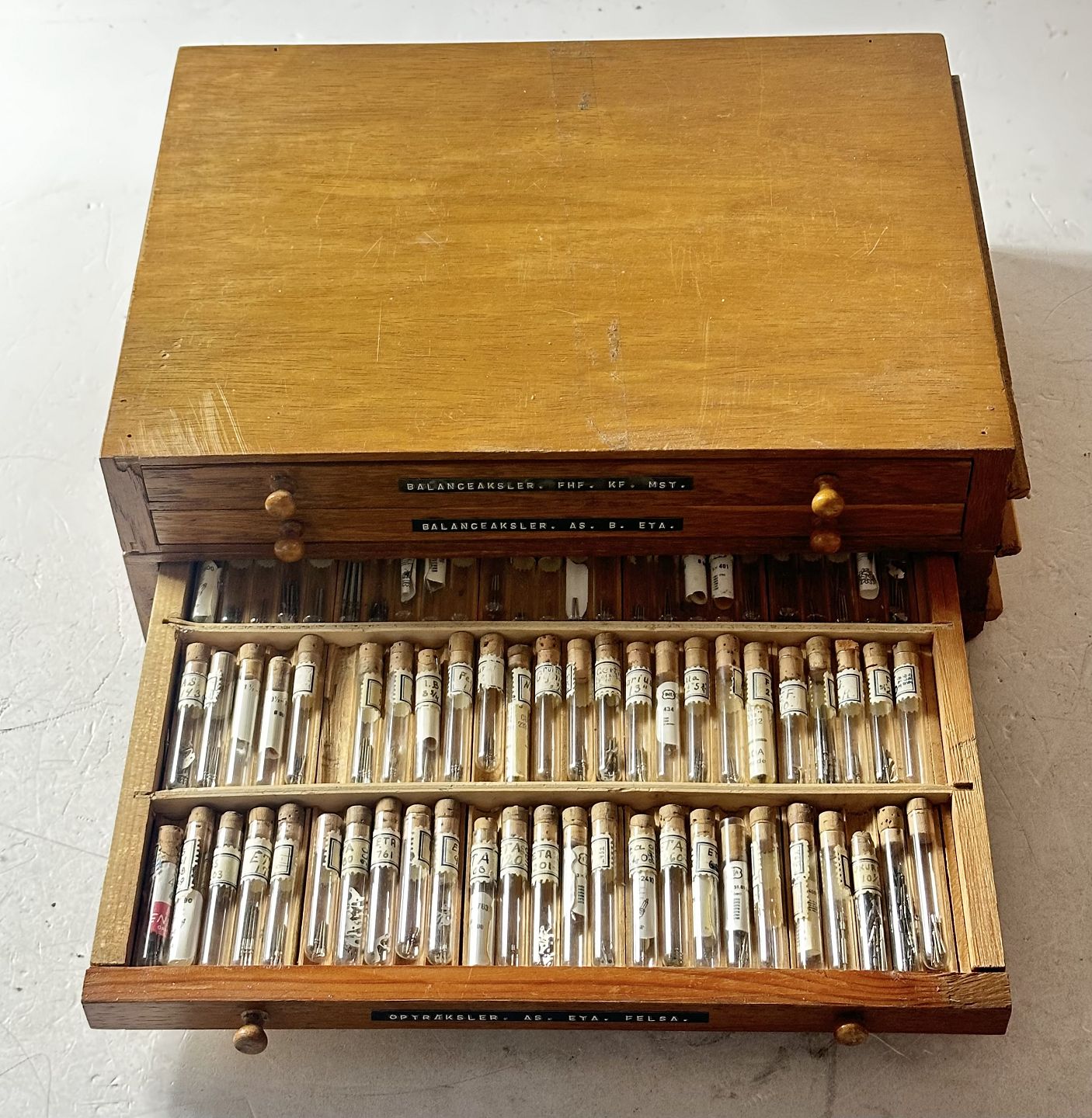 Trækasse med urmagerværktøj og diverse reservedele bl.a. balanceaksler og optræksler.
