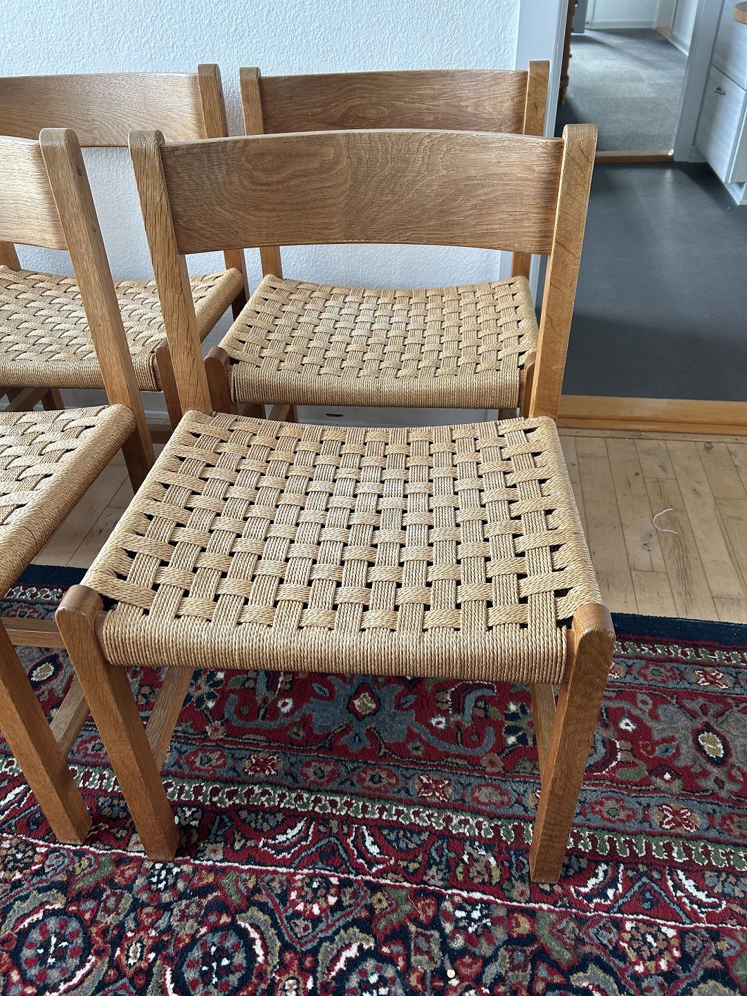 Dansk møbelproducent - Seks spisestole med stel af massivt eg, sæder med flet. Sh. 48 cm.