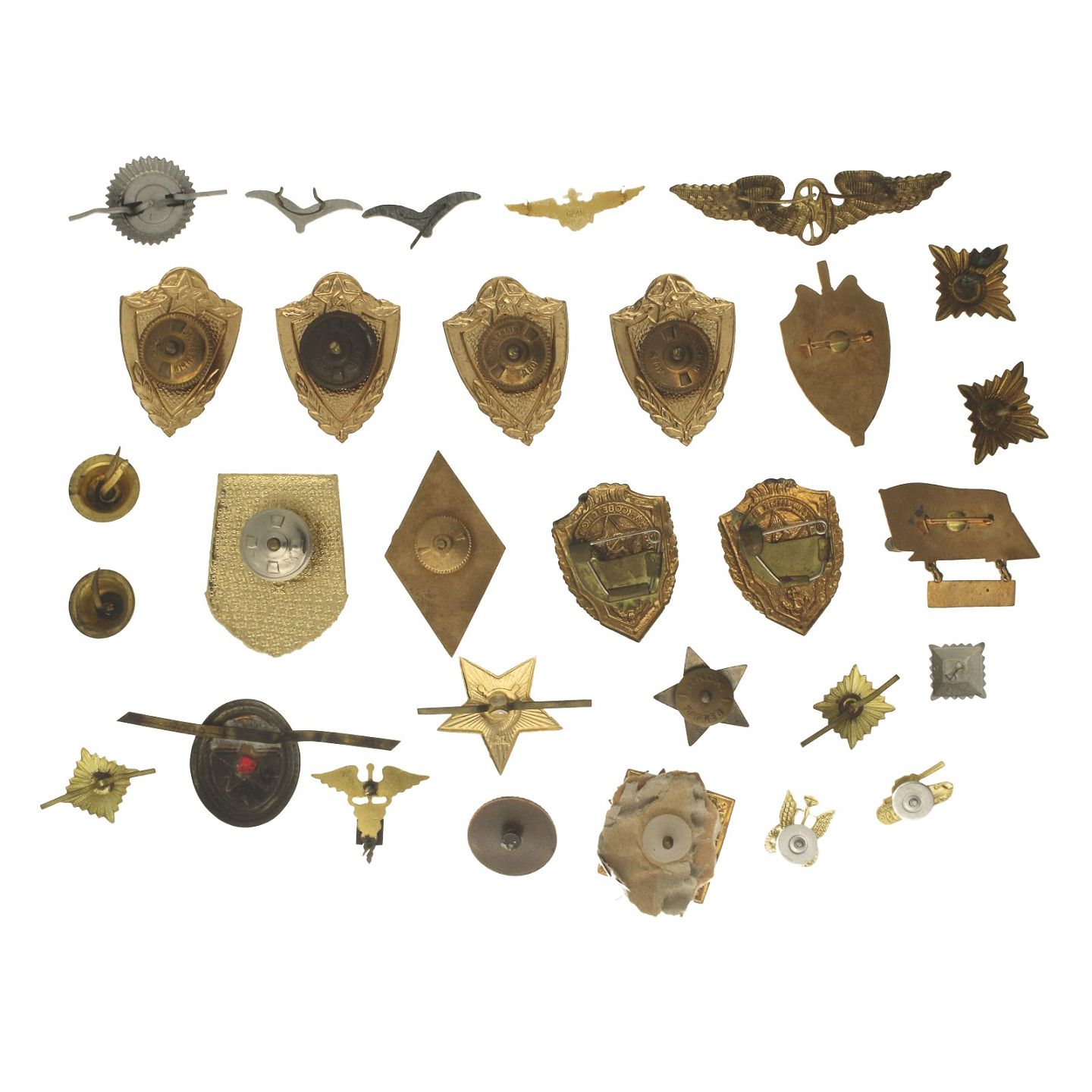 Diverse emblemer, bl.a. Sovjetunionen. Udført af metal, forgyldt metal og emalje