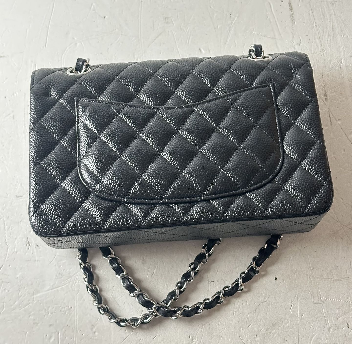 Chanel - Classic Double Flap taske str. small taske af sort quiltet caviar læder med sølv hardware, dobbelt kædehank, en udvendig baglomme, CC drejelås, indvendige lommer og bordeaux læder.