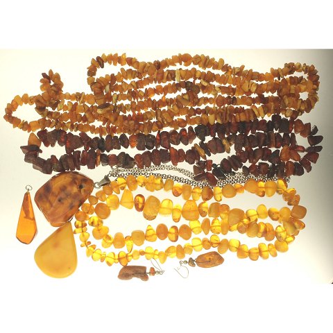 Tre halskæder, en halskæde af sølv, tre vedhæng samt et par øreringe.