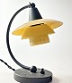 Poul Henningsen - PH natbordslampe med stel og fod af patineret messing, konisk top, monteret med 1/1 skærmsæt af gulbemalet et-lags glas. Tråben mærket “Patented”. Udført 1940'erne hos Louis Poulsen. H. ca. 24 cm.