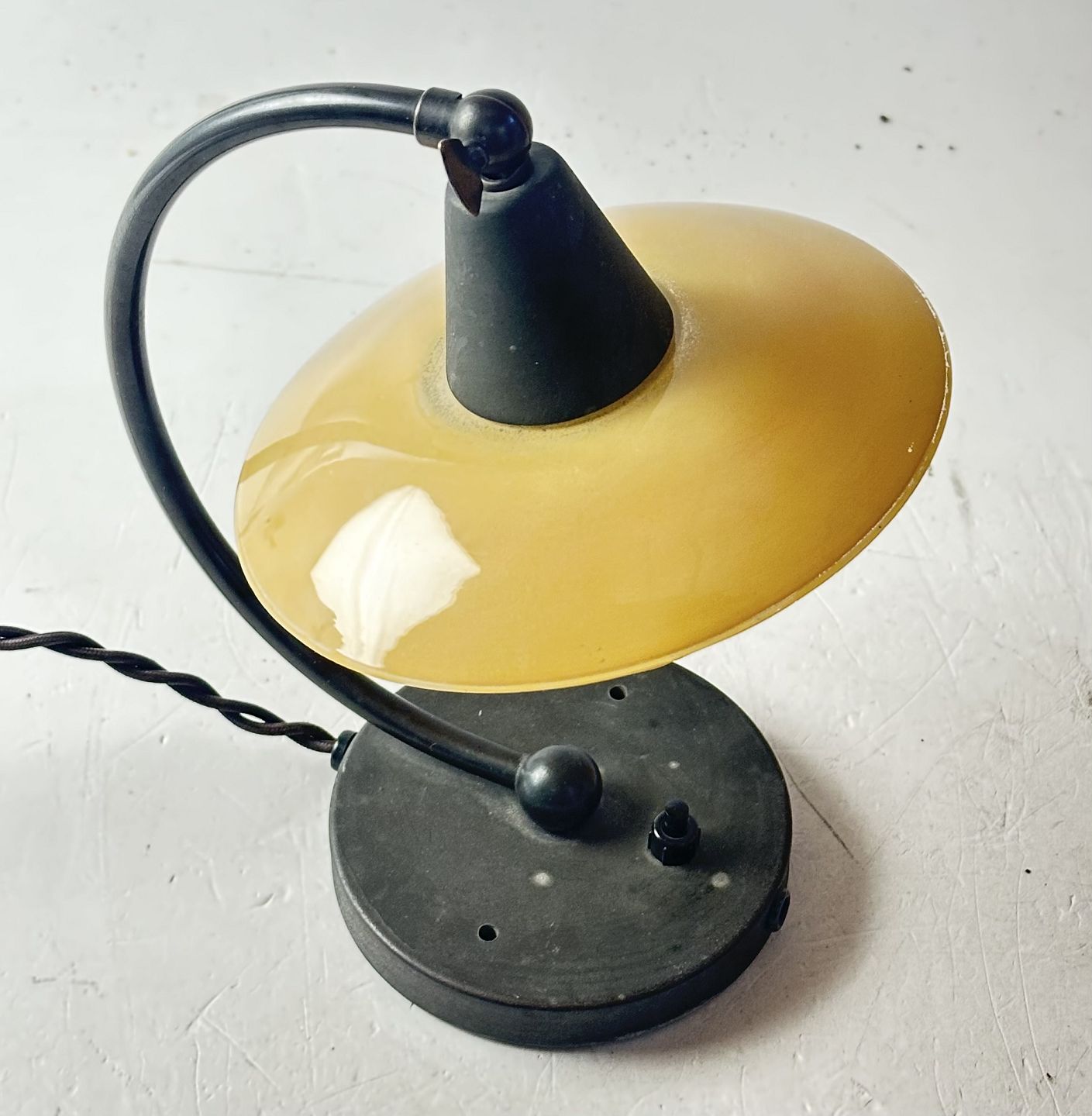 Poul Henningsen - PH natbordslampe med stel og fod af patineret messing, konisk top, monteret med 1/1 skærmsæt af gulbemalet et-lags glas. Tråben mærket “Patented”. Udført 1940'erne hos Louis Poulsen. H. ca. 24 cm.