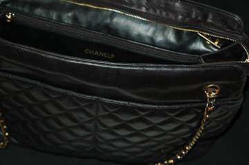 Coco Chanel, stor klassisk Chanel-taske, vintage, 37 x 27 cm, Stemplet på indersiden "made in Italy", udført i lækkert mørkeblåt læder.