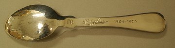 Georg Jensen barneske, udført i let hammerslået sterlingsølv, prydet med carneol. Jubilæumsmodel 1904-1979, original æske medfølger. Skeen er tegnet af Georg Jensen i 1904 og blev i 1979 brugt til at markere Sølvsmediens 75 års jubilæum.