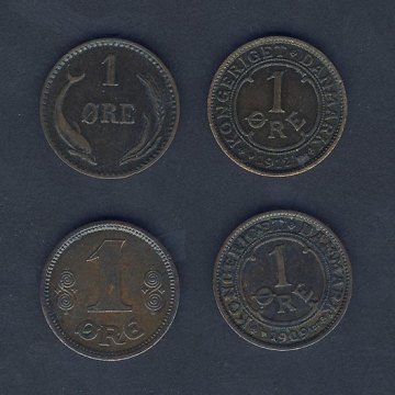 1 ører hhv. 1913, 1909, 1883 og 1912