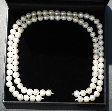 2 halskæder med hver 42 ferskvandskulturperler. Diam. 8 mm. Æske fra Hingelberg medfølger