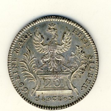 Frankfurt, 20 kreuzer 1765 C 52a - TOPKVALTET, står anført i krause til 165 dollar i kv.01 - denne er ganske betragteligt bedre, hvilket vi håber ses ud fra billederne