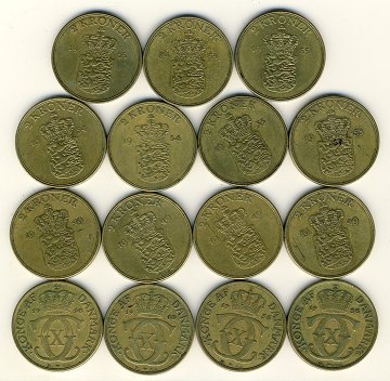 | Lot gule 1 + 2 kroner: 1 kroner 1929 (3), 1931 (3), 1934 (3), 1936, 1939 (3), 1940 (2), 1941 (2), 1943, 1948 (2), 1949 (2), 1955 (2), 1957, 1959. 2 kroner 1936 (2), 1940 (2), 1949 (4), 1953 (2), 1954 (2), 1955 (3)