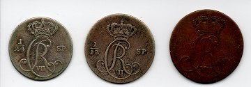 Christian VII, 1 dreiling 1787 Hede 47, 1/24 speciedaler 1796 Hede 44, 1/12 speciedaler 1797 Hede 43
