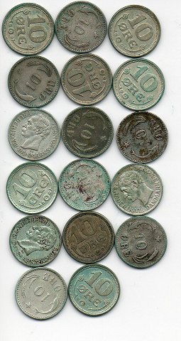 HANDLERLOT? 10 øre 1874, 75, 89, 91, 94, 97, 05, 07, 10, 12, 14, 15, 16, 17, 18, 19, 21