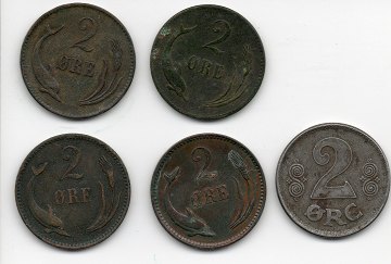2 øre 1875, 1876, 1886, 1906, 1919 iron