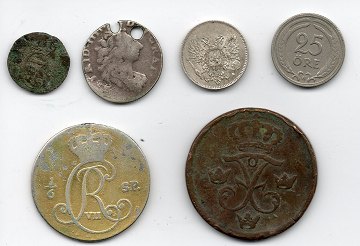 Blandet lot Danmark, Norge, Sverige og Finland: DK 1/6 speciedaler 1787 forgyldt. Norge 8 skilling 1711, 1 skilling 1779. Sverige 1 øre 1736, 25 øre 1921. Finland 25 penni 1917