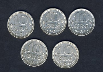 10 ører (5): 1914, 1916, 1917, 1918 og 1919