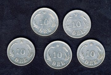 10 ører: 1874, 1897, 1899, 1903 og 1905