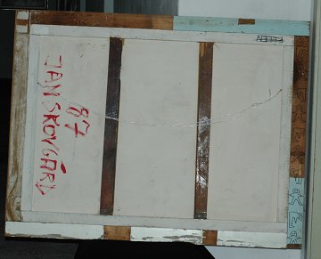 Jan Skovgård, abstrakt komposition, olie på masonit 105 x 135 cm, signeret verso "Jan skovgård 87", gammel prismærke på 8000 kr. på bagsiden.