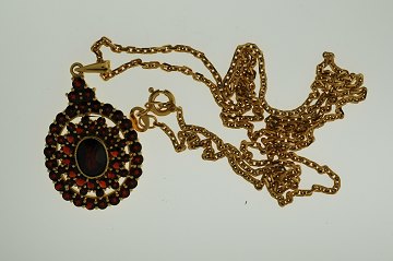 Halskæde i forgyldt 830/1000 sølv med vedhæng i forgyldt sterling sølv. Vedhænget er prydet med talrige granater. æske medfølger.