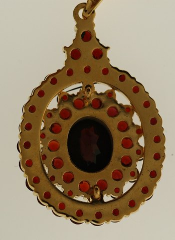 Halskæde i forgyldt 830/1000 sølv med vedhæng i forgyldt sterling sølv. Vedhænget er prydet med talrige granater. æske medfølger. Vedhænget målet 30 mm x 20 mm og kæden er 58 cm lang.