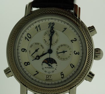 Daltini DT, automatisk urværk med kalender funktioner, moonphase, uret er helt nyt og har stadig beskyttelses folie, foldespænde, transparent bagkapsel, diam. 42 mm.