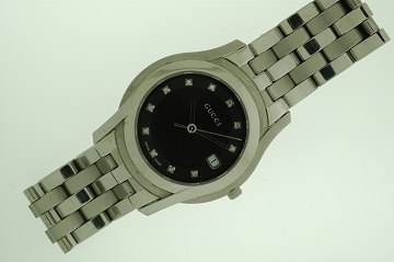 Gucci herrearmbåndsur i stål, sort skive med brillanter, safirglas, quartz urværk, diam. 35mm
