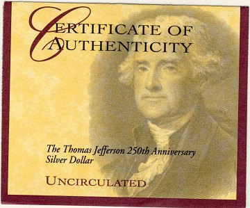 USA, Mønt præget i anledningen af 250-året for Thomas Jeffersons fødsel, ucirkuleret 90% sølv. 26,7 gr.