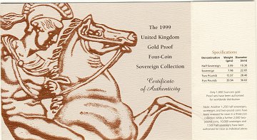 England, møntsæt bestående af 4 GULD Sovereigns hhv. half-sovereign 3,99 gr. Sovereign 7,98 gr. 2 pund 15,97 gr. 5 pund. Total vægt: 39,94 gr. 22 kt. GULD proof kvalitet