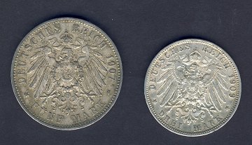 Wurttemberg, 3 mark 1909F, 5 mark 1907F, KM 635, 632