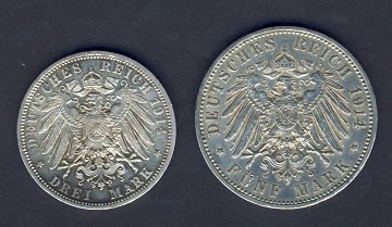 Preussen, 3 mark 1914A, 5 mark 1914A, KM 538, 536