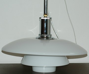PH Poul Henningsen (1894-1967) 4½-4 pendel med skærme af mundblæst hvidt opal glas, lille afblændingskærm i aluminium og fatningsskjuler i forkromet aluminium. H. 41 cm. Diam. 48 cm