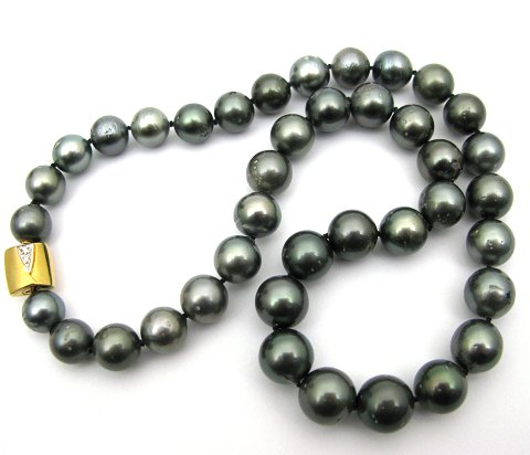 Southsea perlecollier med lås af 18 kt. guld, prydet med 4 brillantslebne diamanter, samlet 0,06 ct., perle diameter 7-11 mm. Kæde L. 45 cm.