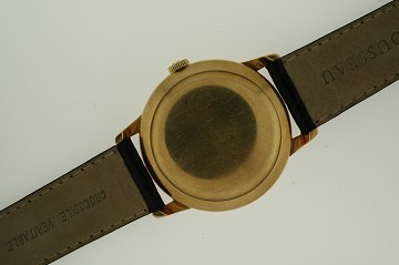 Omega herrearmbåndsur i 14 kt. guld, manuelt optræk, urværk cal. 283, plexiglas, jean rousseau krokodillelæderrem, uret er fra 1950'erne. Diam. 36 mm