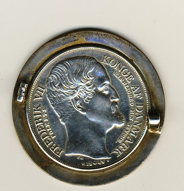 Frederik VII, Specie 1848 mounted in brooch with blue emaille. Needle on back missing.