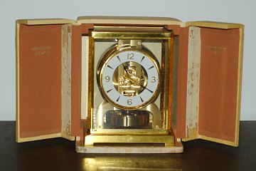 Jaeger LeCoultre, Mrk. Atmos, bordur i kasse af messing og glas, hvid emaljeskive. H. 22 cm.