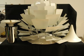 Poul Henningsen (1894-1967), Koglen, hvidlakeret stål, Ø 60 cm. Lampen fremstår som ret brugt og trænger til lidt småreparationer. Enkelte steder er lakeringen skaldet af.