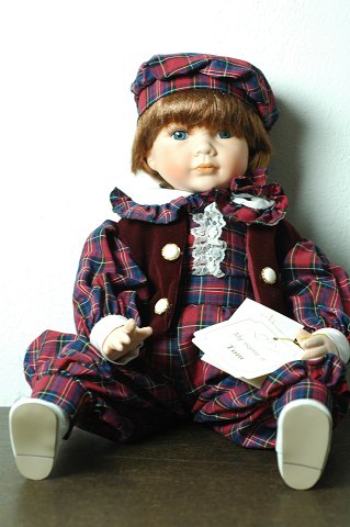 Flot porcelænsdukke fra The Leonardo Collection "Tom", med tøj, vest, sko og hat af meget høj kvalitet. H. 40 cm