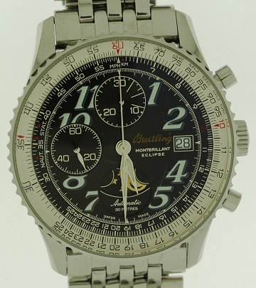 Breitling Montbrillant Eclipse herrearmbåndsur i stål, automatisk urværk, breitling 43 urværk, ref nr. 43030, kronograffunktioner, diam. 41,5 mm, urkassen er 15,5 mm tyk, mineral glas.
