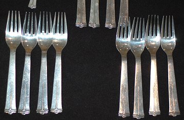 Middagsgafler og skeer af sterling sølv, de resterende dele af 3-tårnet sølv. 2 dele med indgraveringer.