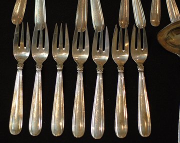 W & S Sørensen "Karina" sølvbestik 37 dele, bestående af: 6 middagsgafler, 7 middagsskeer, 7 kagegafler, 4 teskeer, 7 kaffeskeer, kartoffelske, sovseske samt 4 dele diverse tagtøj.