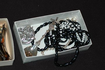 Lot med bordskål i 3-tårnet sølv, lille ske i sølv, broche i 3-tårnet sølv og lille etui i sølv. En lille kasse med diverse håndspænder og brocher. En kasse med plastik perlekæder og ske. 3 små glaskrukker.