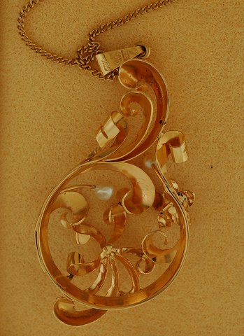 Vedhæng i 18 kt. guld med kulturperler samt kæde ligeledes 18 kt. samlet vægt: 9 gr. Æske fra K. Anderson i Stockholm medfølger.