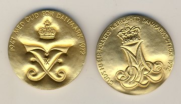 Erindringsmedaljer i anledning af tronskiftet 1972. Sæt på 2 medaljer i GULD 18 kt. Der er præget 500 sæt hvoraf nærværende sæt har nummer 72. Certifikat og æske medfølger.
